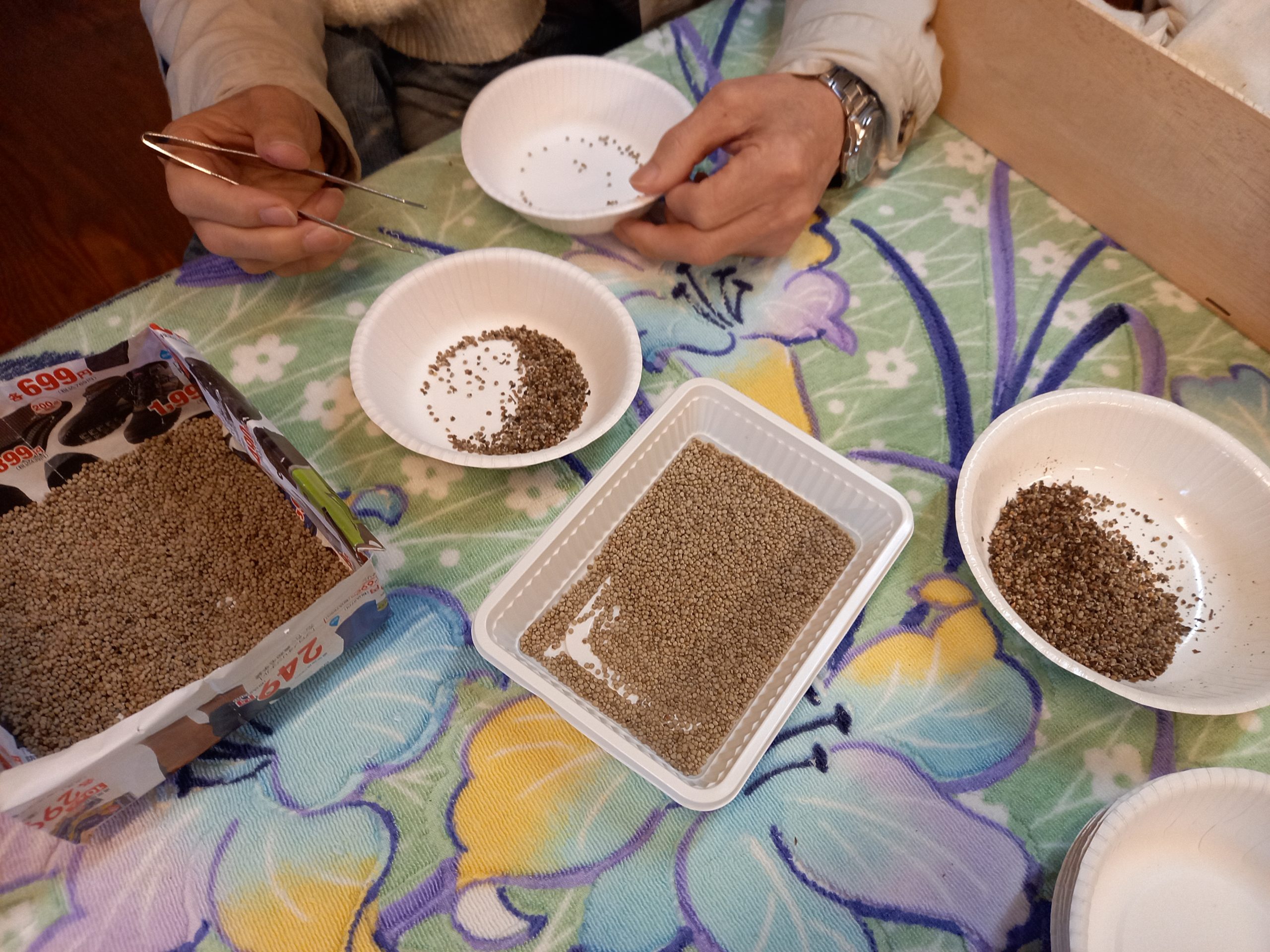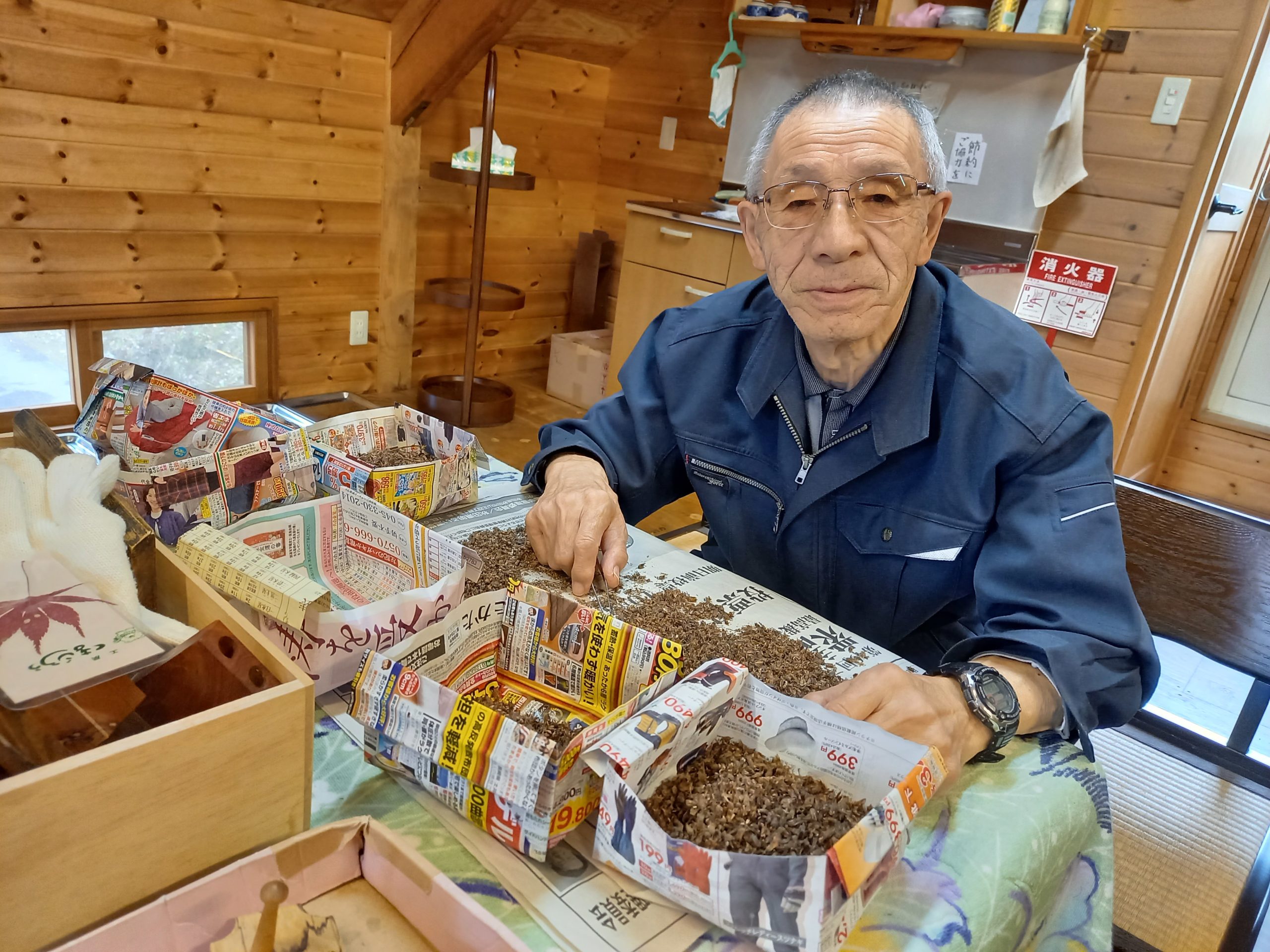 木工品の磨きは勿論の事、畑で収穫したエゴマやシソの種子取りも行っています。