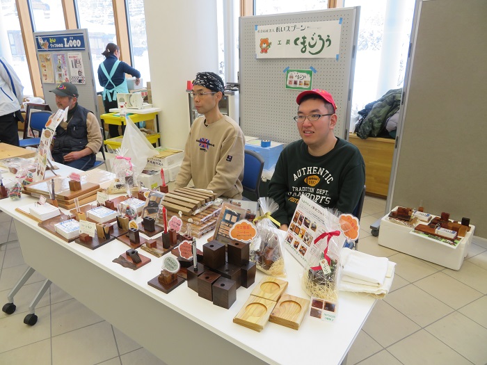 12月4日(水)、湯沢市役所1階にて行われた『ふれあいマルシェ』に今年度も参加させて頂きました。就労支援事業所などが集い、商品の販売を行うイベントです。工房くまごろうでは木工製品、ハム、カレーなどを用意し、利用者と職員がチームを組んで出店しました。