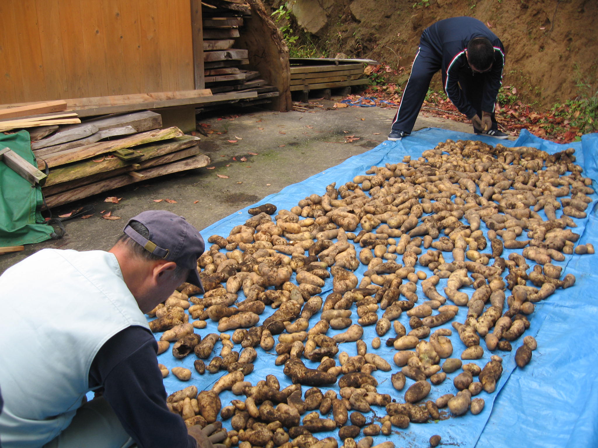 工房に戻って、1個づつていねいに土を落として、広げて並べて、乾かします。