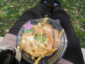 満開の桜の下で食べるジューシーなかつ丼は格別の味!まさに醍醐味!