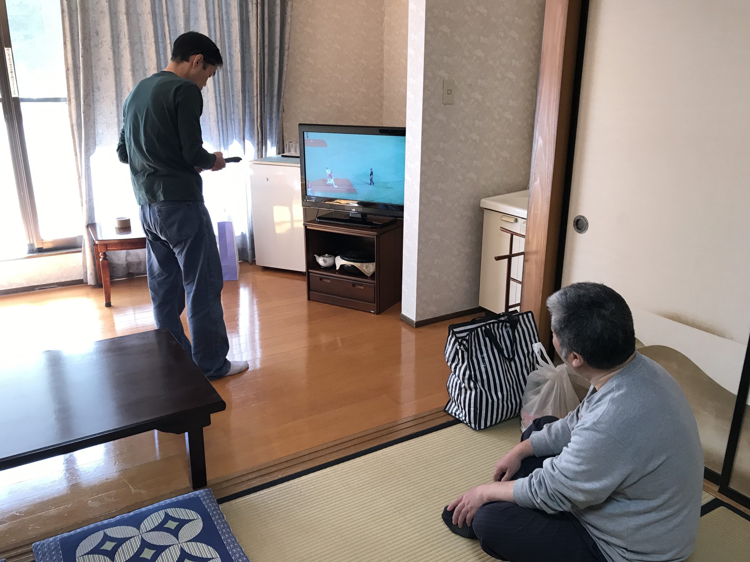 広い客室の畳の上で横になり、ゆっくりとテレビを見ているメンバーもいます。