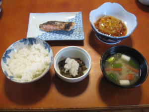 斜め上の青い皿は「いわしの胡麻漬け」です。