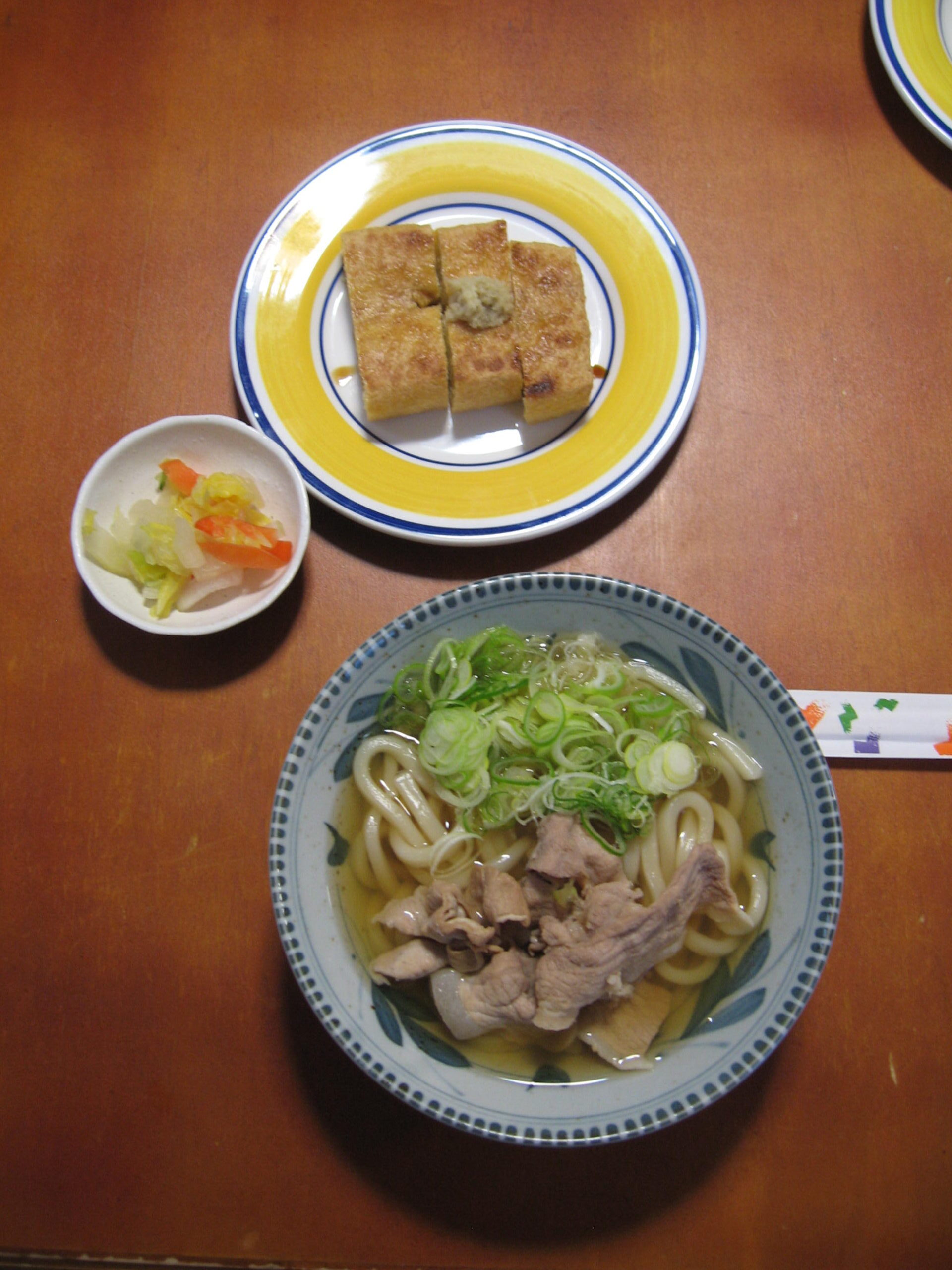 月曜日の夕食は肉うどんと栃尾の油揚げ。