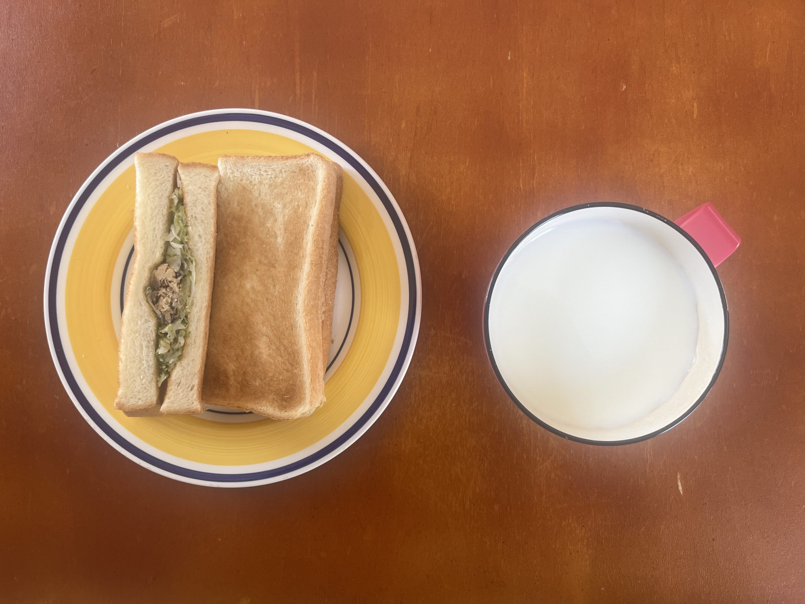 朝食はオイルサーティンとコールスローサラダのサンドイッチ!