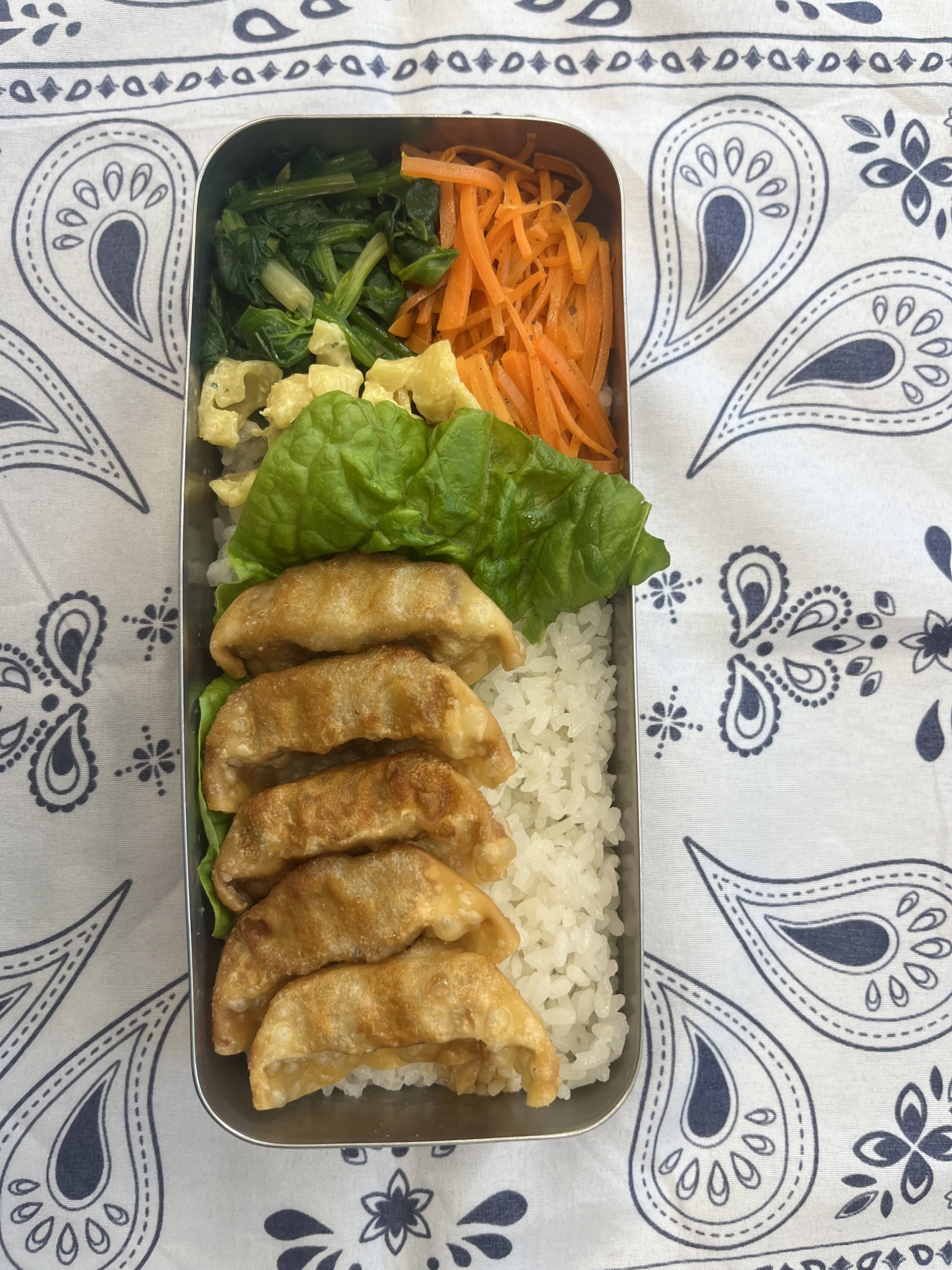 木曜日のお昼は揚げ餃子弁当!にんじんや野菜の彩りとも映えますね!
