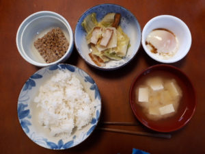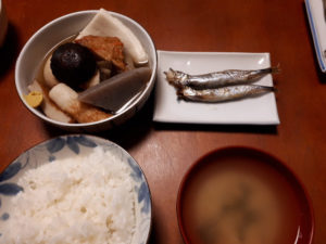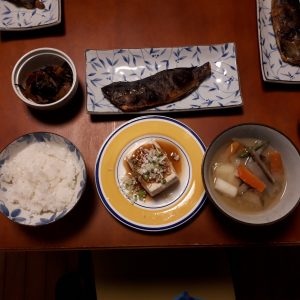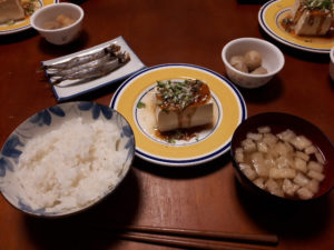 湯豆腐、焼きししゃも、いものこの煮物、みそ汁
