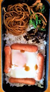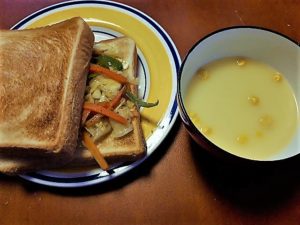 こんがり焼いた食パンにマーガリンを塗り、野菜炒めを挟んだものです。食材はキャベツ、人参、ピーマン、ウインナーなど。