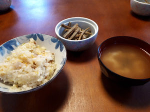 タコの刺身、具だくさんみそ汁、切り干し大根の煮付け など