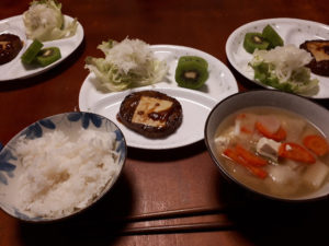 ホッケの干物、ひじきの煮物、湯豆腐、具沢山みそ汁