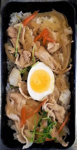 納豆丼、温泉玉子、野菜の煮物、みそ汁