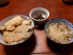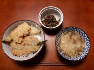 イワシ天、アスパラ天、イカ天です。タレは甘くせず、素材の味を生かした味付けです。