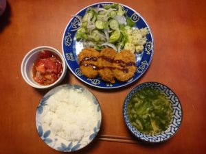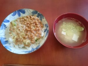 納豆丼ととうふのみそ汁、祭りに行った日の量を控えた朝食です。