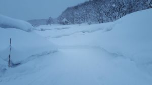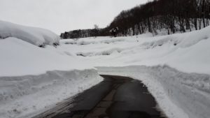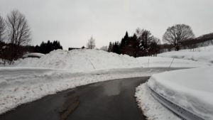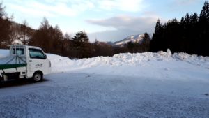 カメラーデンの駐車場は雪捨て場にしていますが、下の道路にあふれそうになっています。