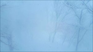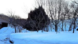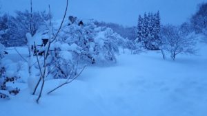 12時過ぎの庭の様子です。地吹雪のため暗くて前も見づらい状況です。