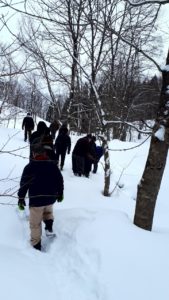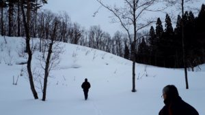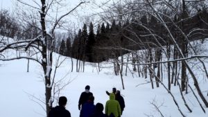 カメラーデンの裏から山に入り、進んでいきます。今はクマも冬眠中なので安全です。