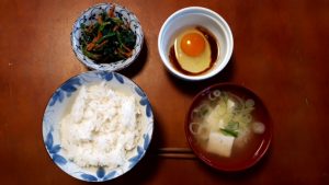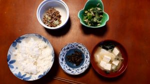 大根の葉のふりかけ、ブロッコリーの玉子炒め、納豆、ワカメと豆腐の味噌汁